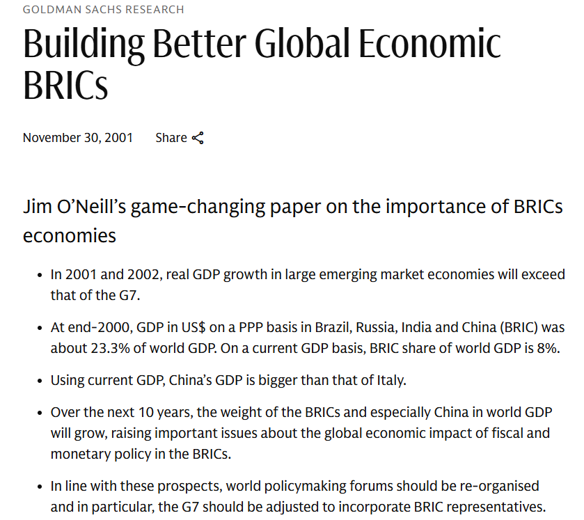 Oppure al F.M.I. Cominciamo col dire che l'idea del BRIC (unendosi poi il Sudafrica divenne brics) nasceva come ricerca per l'investimento di un analista economico della Goldman Sachs.
