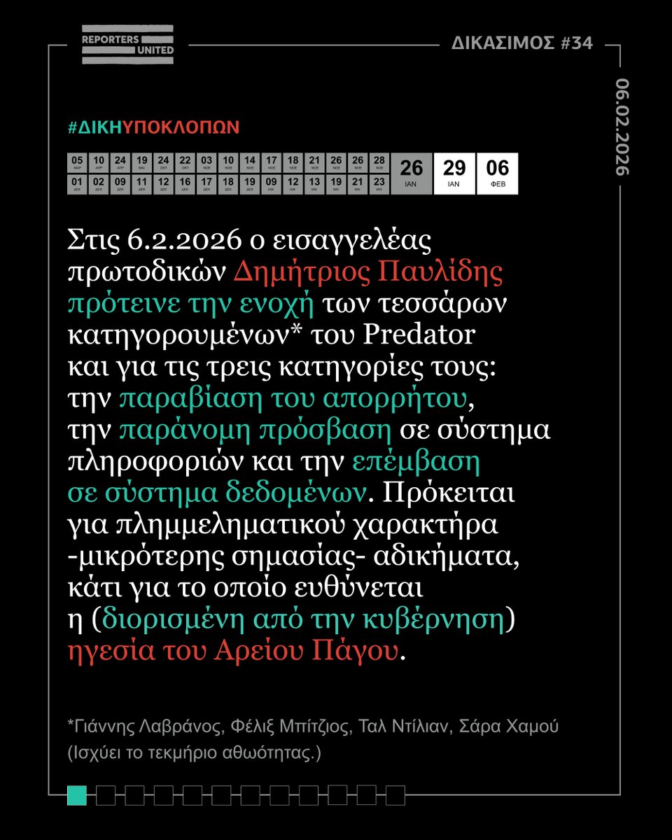 2⃣ Στις 6.2.2026 ο εισαγγελέας πρωτοδικών Δημήτριος #Παυλίδης πρότεινε την ενοχή των τεσσάρων κατηγορουμένων του #Predator και για τις τρεις κατηγορίες τους: την παραβίαση του απορρήτου, την παράνομη πρόσβαση σε σύστημα πληροφοριών και την επέμβαση σε σύστημα δεδομένων.