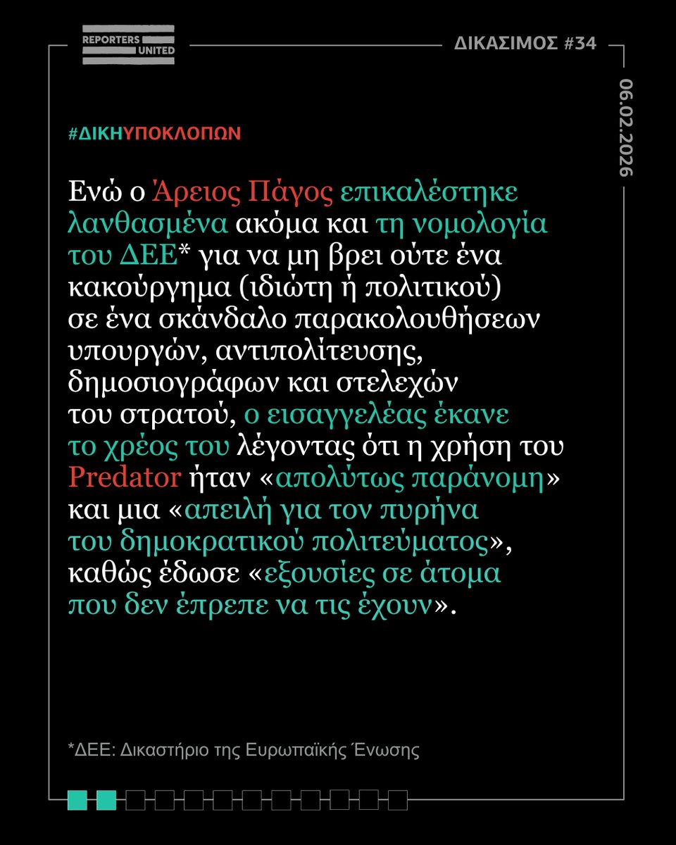 2⃣ Στις 26.1.2026 οι δικηγόροι των θυμάτων του #Predator ανέγνωσαν νέα κρίσιμα έγγραφα που αποδεικνύουν την απόλυτη συγκάλυψη των υποκλοπών #ΕΥΠ - #Predator από την εισαγγελία του Αρείου Πάγου, η ηγεσία της οποίας διορίζεται απευθείας από την εκάστοτε κυβέρνηση, γεγονός που υπονομεύει την ανεξαρτησία της Δικαιοσύνης, σύμφωνα και με την έκθεση της Ευρωπαϊκής Επιτροπής για την κατάσταση του Κράτους Δικαίου στην Ελλάδα.