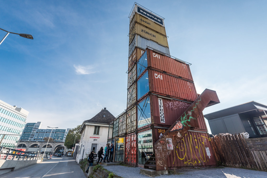 La Freitag Tower no es una tienda chic en el centro de la ciudad; es un "rascacielos" construido con 19 contenedores marítimos instalado en la zona industrial donde nació la idea original de Freitag.