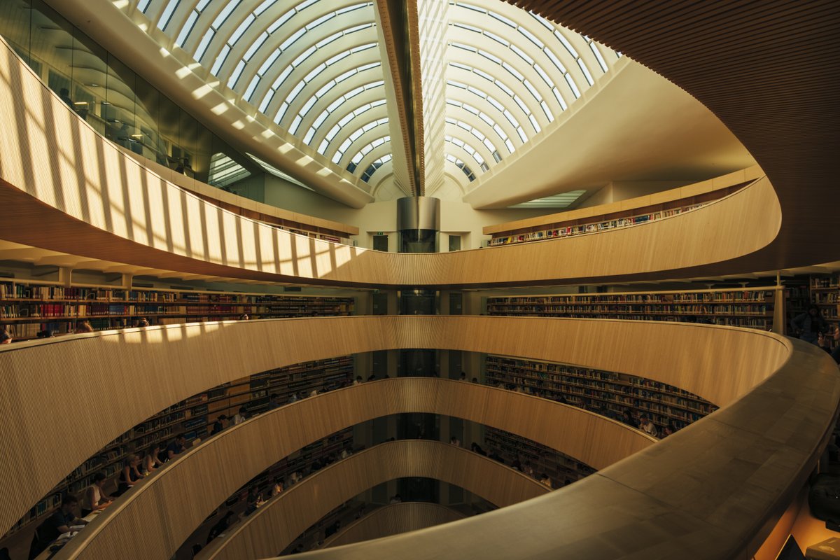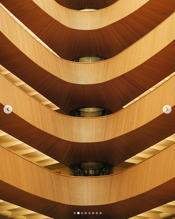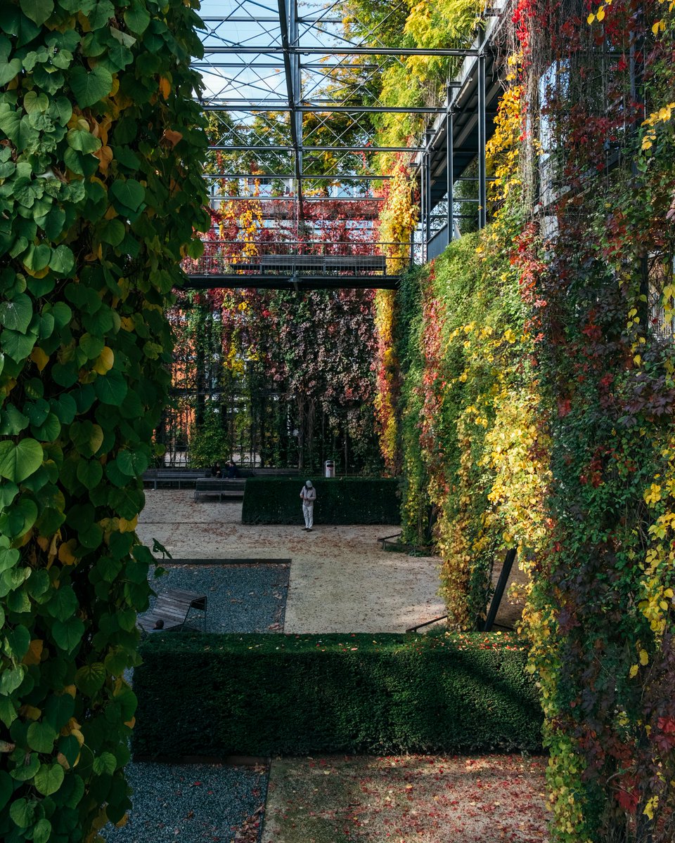 Al sentarte en los bancos y mirar arriba te das cuenta de que esa silueta angulosa no es casual y no es solo un diálogo con las cubiertas del antiguo museo.
