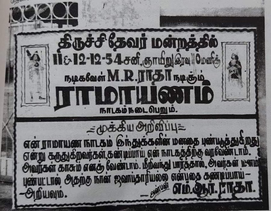 என் ராமாயண நாடகம் இந்துக்களின் மனதை புண்படுத்துகிறது என்று கருதுகிறவர்கள் கண்டிப்பாக என் நாடகத்திற்கு வர வேண்டாம் அவர்கள் காசும் எனக்கு வேண்டாம் மீறி வந்து பார்த்தால் அவர்கள் மனம் புண்பட்டால் அதற்கு நான் ஜவாப்தாரியல்ல என்பதை கண்டிப்பாய் அறியவும் என்று விளம்பரத் தட்டி 1/4