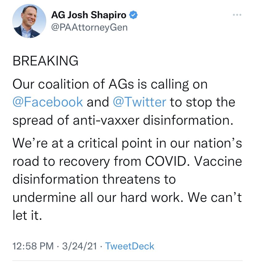 🚨On 3/24/21, Attorney General @JoshShapiroPA sent a letter to Mark Zuckerburg and Jack Dorsey, asking them to deplatform anyone who would,