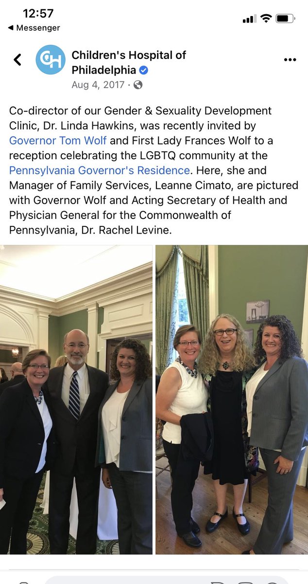 Rachel Levine and Tom Wolf were big supporters of the CHOP gender clinic, as seen in many social media posts. Levine even attended the 5 year Gender clinic celebration which included a trans flag made of cupcakes.