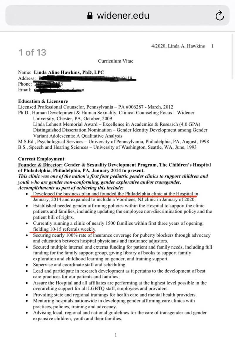 In 2014, Linda Hawkins Co-Founded the CHOP Gender Clinic, In her CV she lists “Developed the business plan and founded the Philadelphia clinic” and “securing nearly 100% rate of insurance coverage for puberty blockers.” Nadia Dowshen was the other clinic co-founder.