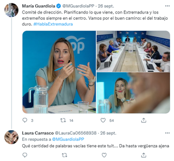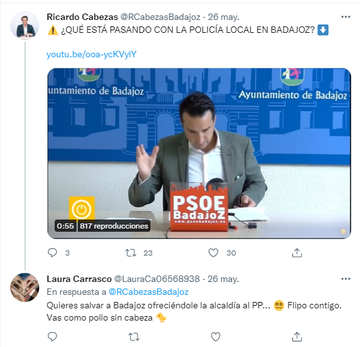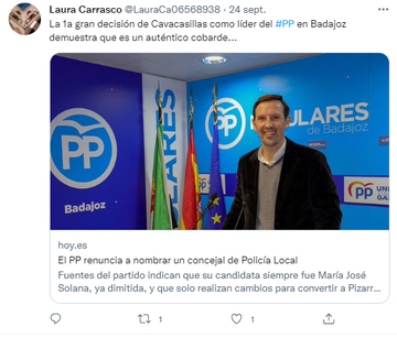 13- Y, OJO, TWEET llamando “auténtico cobarde” al líder del PP en Badajoz @AntonioCavacasillas y “postureo que da hasta vergüenza ajena” a su líder regional @MGuardiolaPP