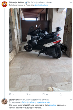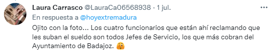 4. Y ahí llega el ataque. Una cuenta anónima, supuestamente una tal "Laura Carrasco", me señala, respondiendo al tuit de @AchoBadajoz, con flechas y círculos en mi cara, tratando de invalidarnos por mi lugar de trabajo. (cubro fotos a un político)