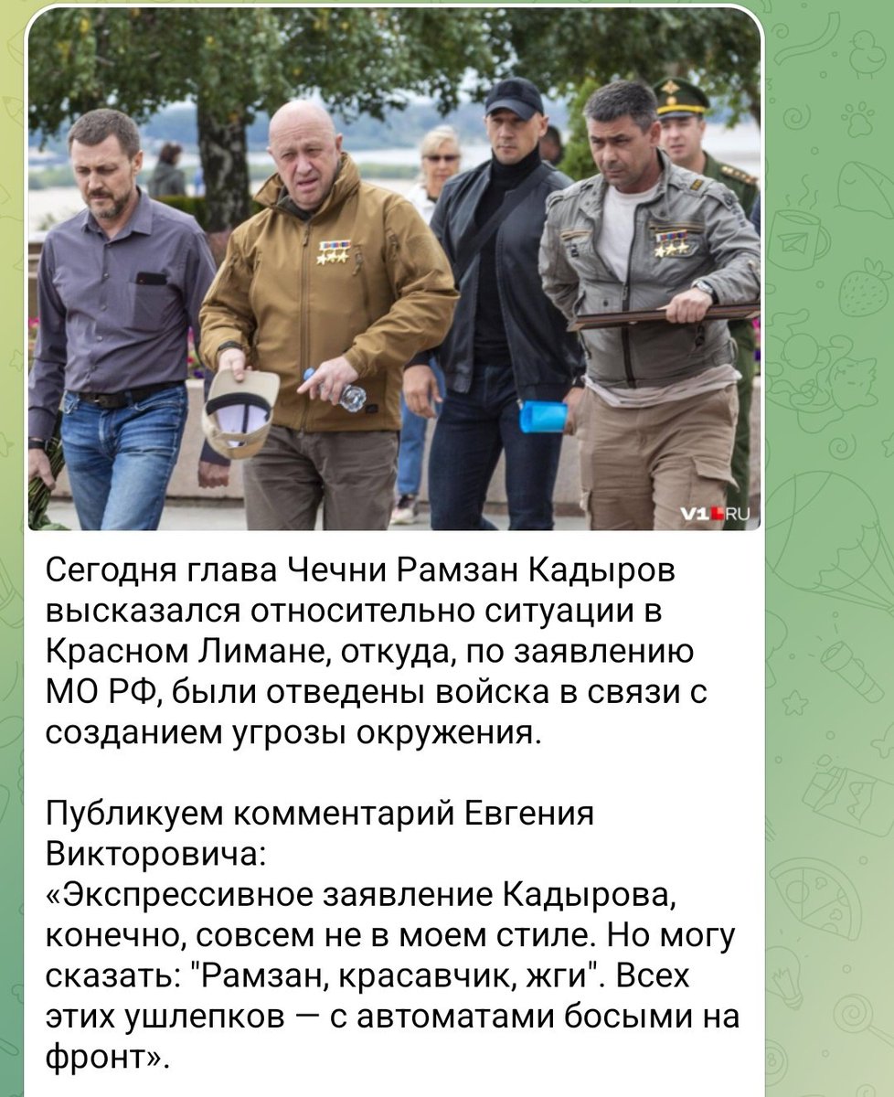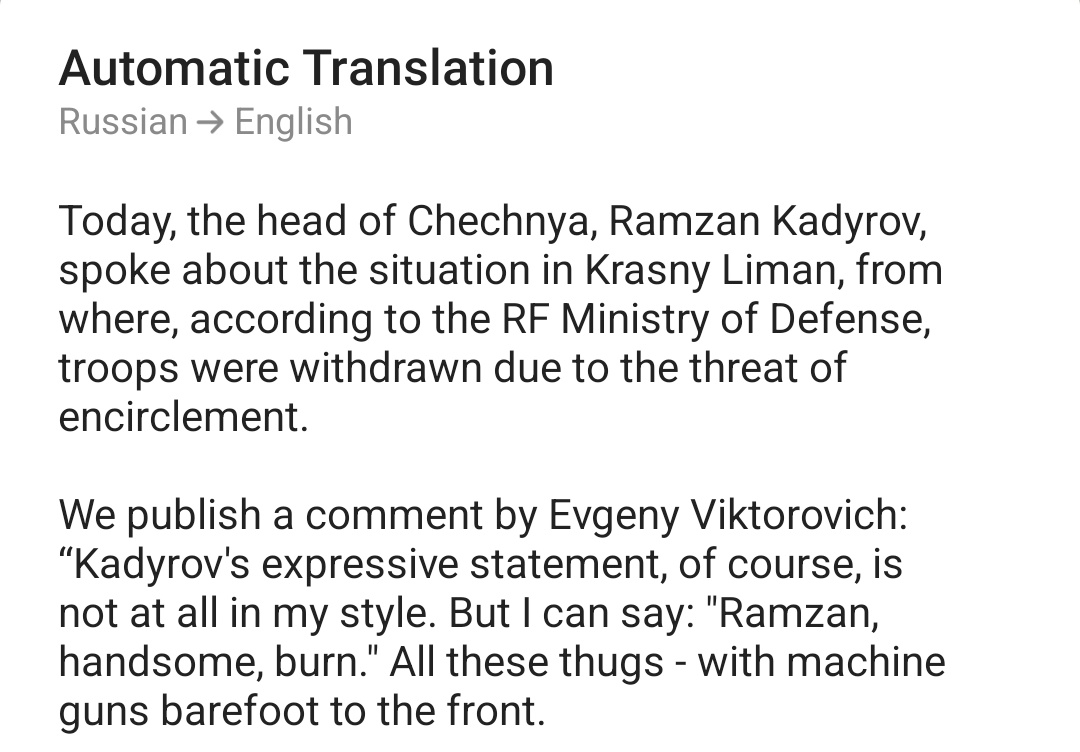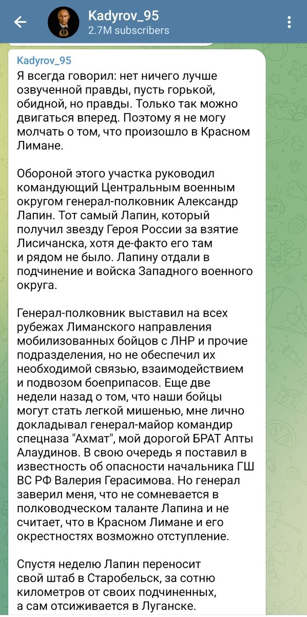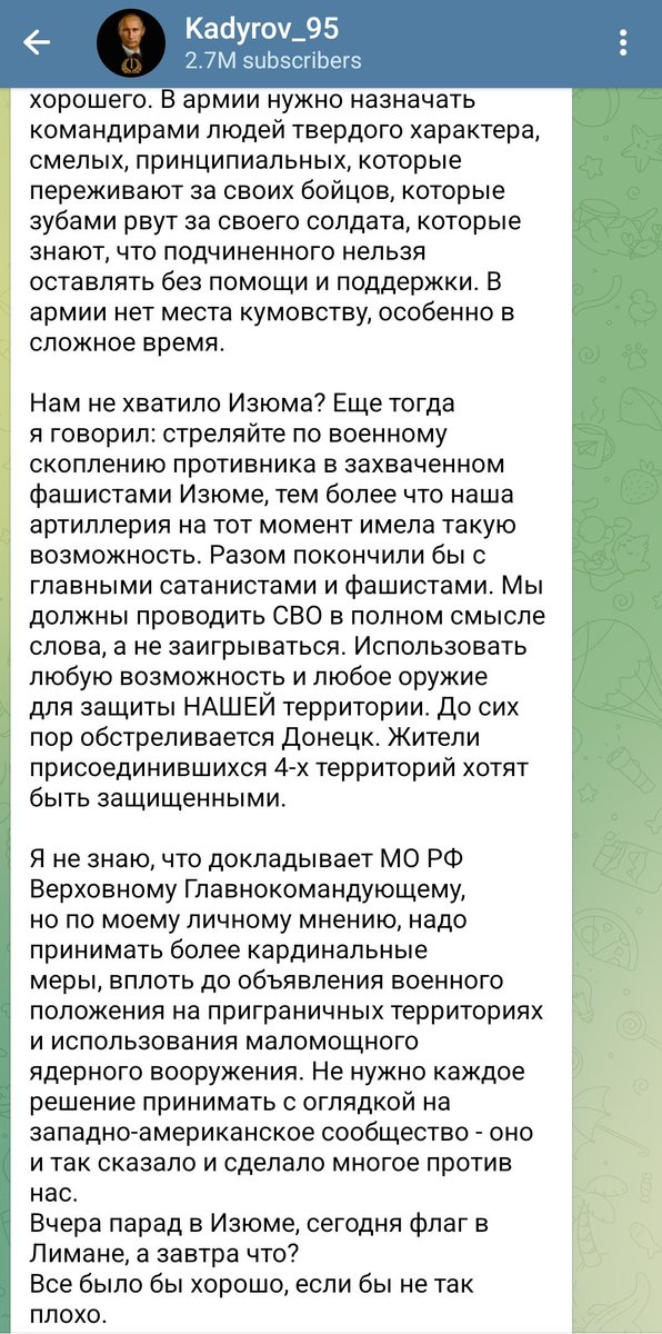 In a long rant clearly not written by the semi-literate (in Russian, not sure in Chechen) Kadyrov, he accuses Chief of Staff Gerassimov of ignoring his warnings that the commanding officer of Lyman=useless, and calls for use of "low-power nuclear weapons". Wonder who wrote this.