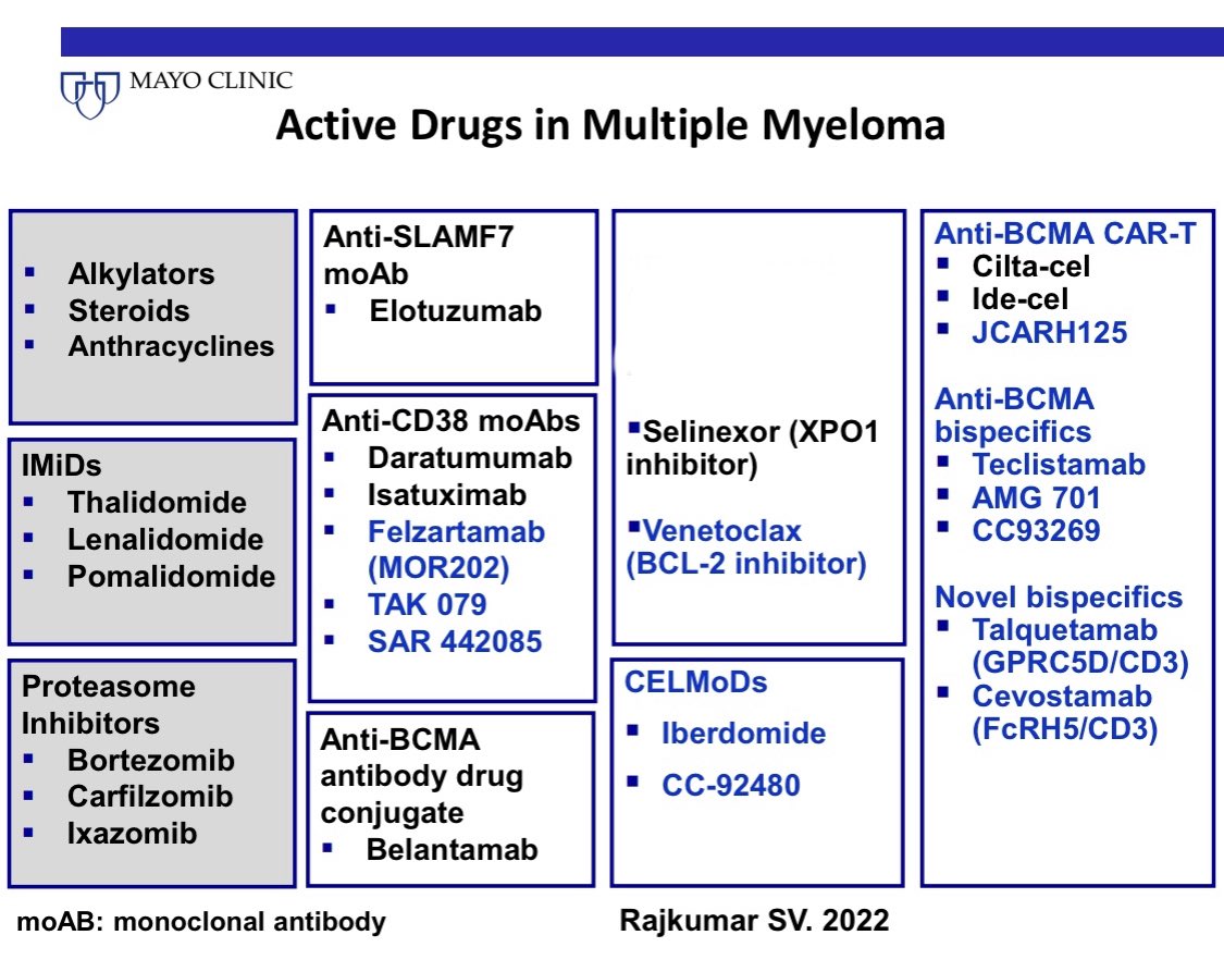 Here is a slide with current active myeloma treatments and their mechanism of action. #MedTwitter@MayoMyeloma
