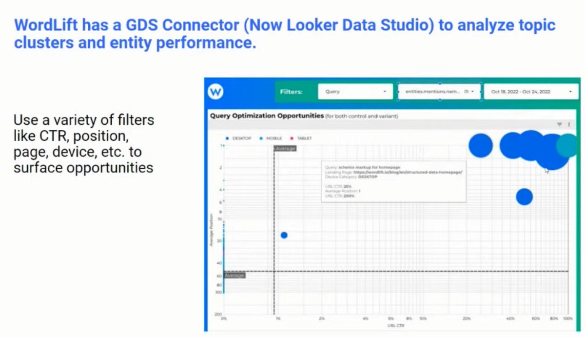 ❯ @wordliftit also provides a connect to Looker/Google Data Studio, so you can track the actual performance of your topical clusters, entity optimization, and idetntify gaps