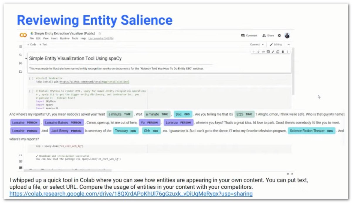 ❯ Using free tools like SpaCy NLP (Python), you can use a Google Colab that @iPullRank set up, you can enter copy, provide a URL or upload a file