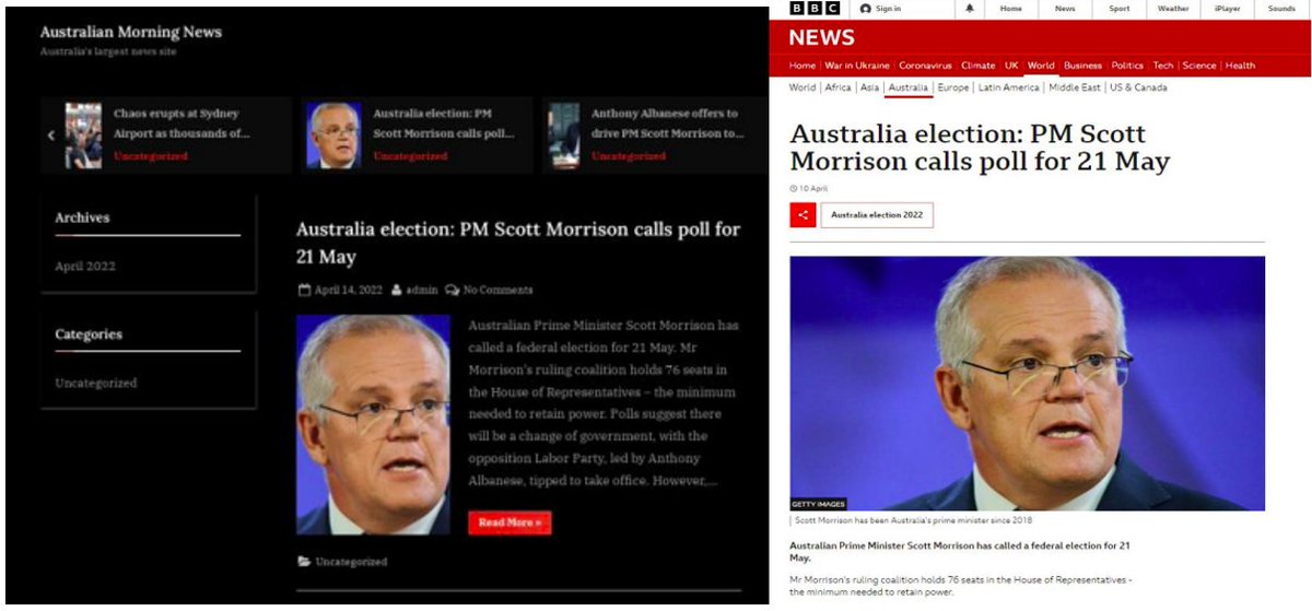 The research from ProofPoint identified the phishing scam used manufactured sites that stole content from other news sites in order to create legitimate fronts like this example below where the left fake site was replicated content taken from the BBC. proofpoint.com/us/blog/threat…