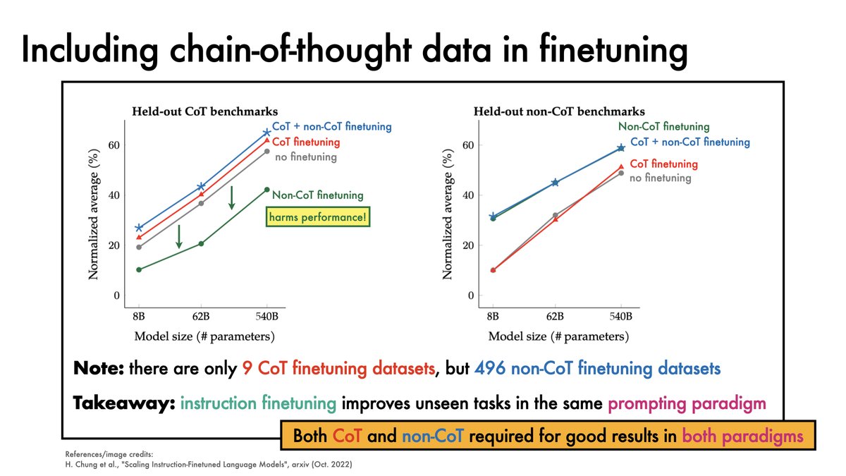 To perform well in both chain-of-thought and non-chain-of-thought prompting paradigms, both kinds of data should be included in the finetuning mixture.