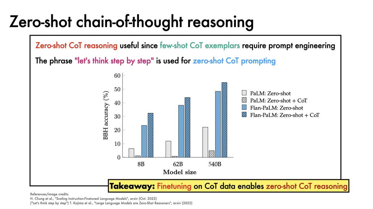Flan finetuning (which includes chain-of-thought data) enables Flan-PaLM to benefit from chain-of-thought prompting in a zero-shot setting.
