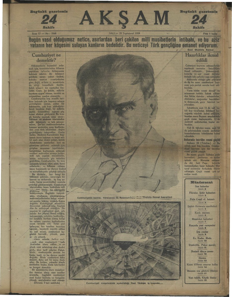 Göğüslerimizin iftiharla kabardığı bu büyük sevinç gününde minnet ve şükran yaşlarıyla ıslak gözlerimiz Büyük Önder’e çevriliyor. (29 Ekim 1935, Akşam)