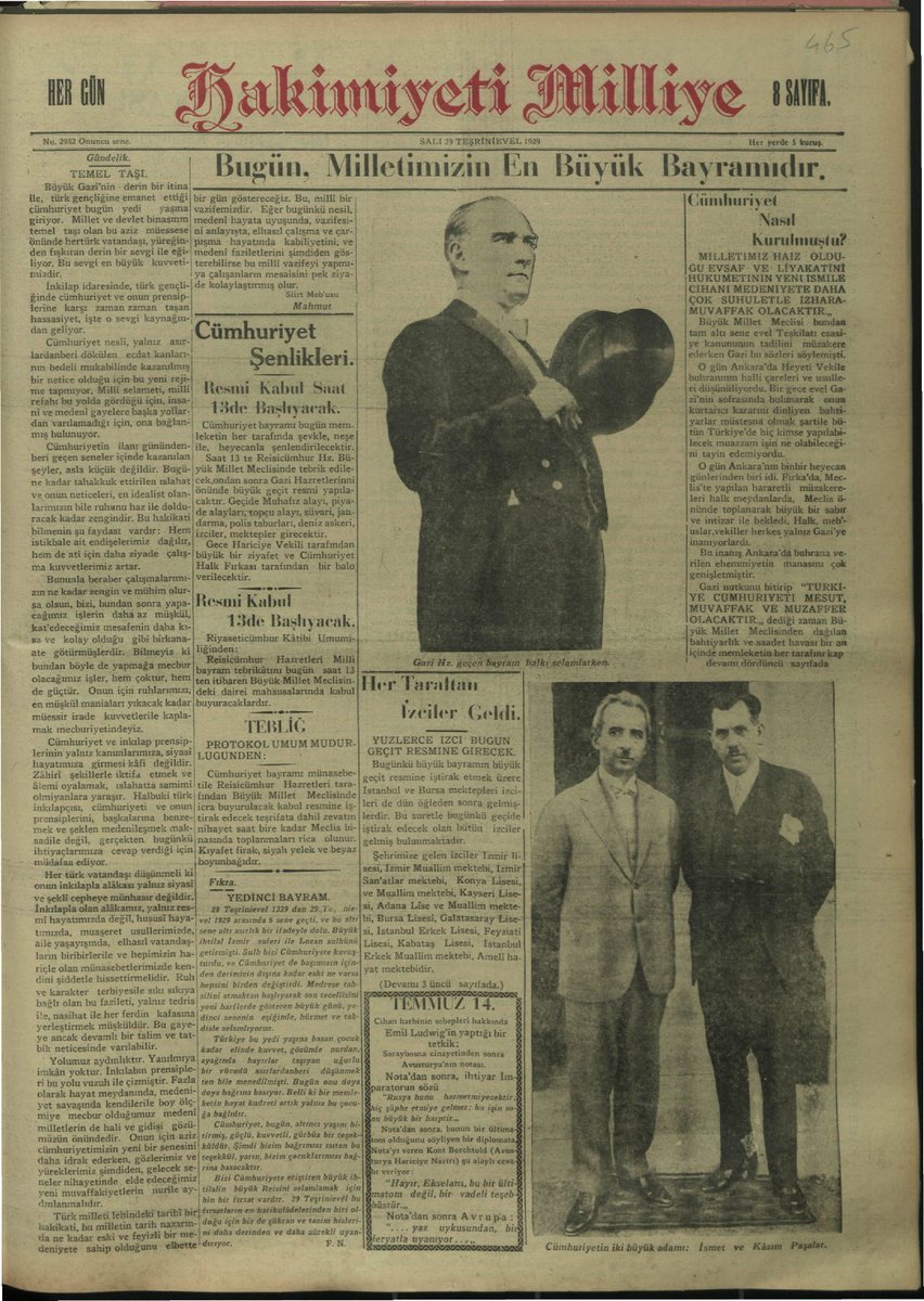 Bundan tam sekiz sene evvel bugün Türkiye Cumhuriyeti ilk gününü yaşıyordu. 1923 senesinin 29 Teşrinievvel (ekim) günü Türkiye tarihte ve şark (doğu) milletleri hayatında yepyeni bir doğum noktası oldu.