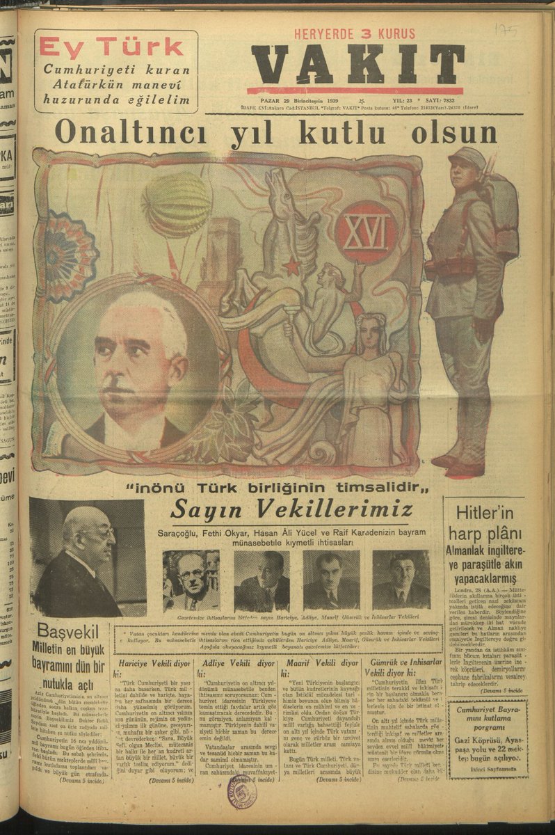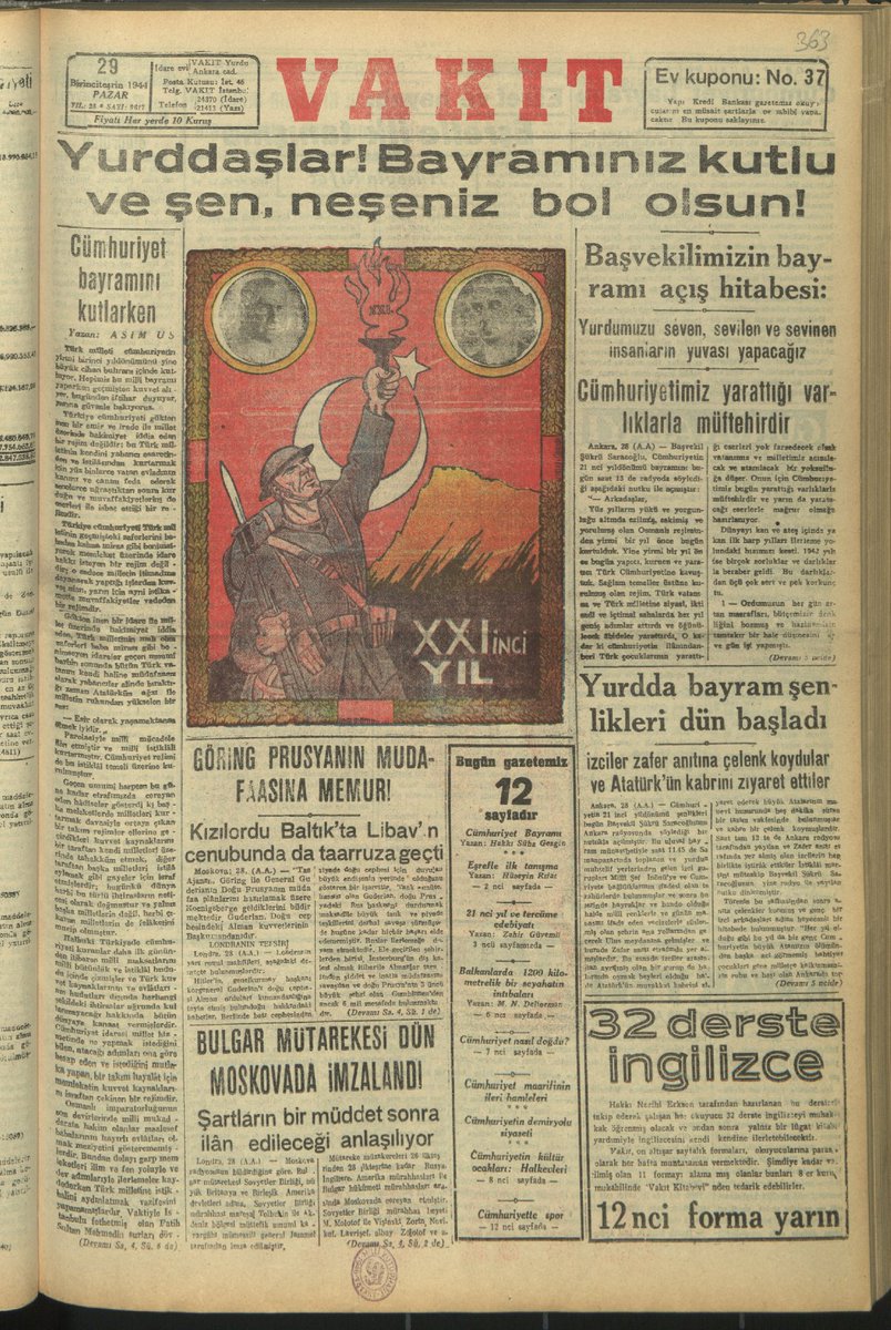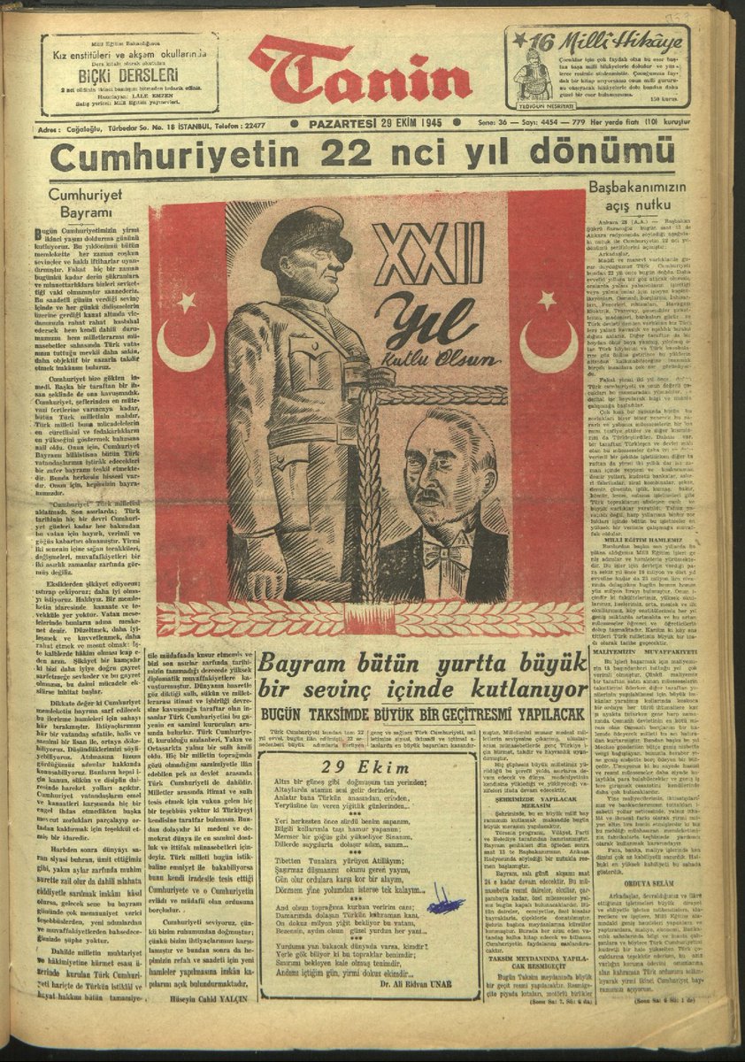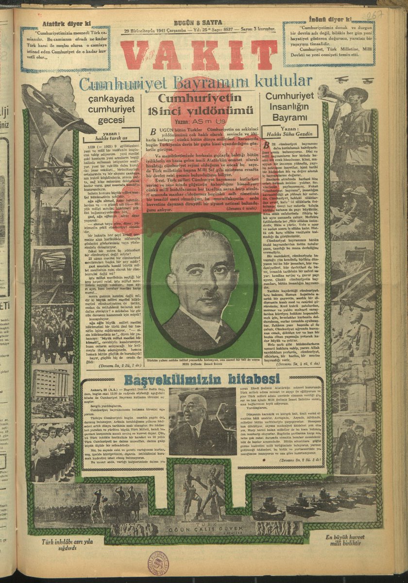 Matbuat (basın) ailesi bugün en büyük milli bayramımız şerefine çalışmayacak, yarın gazeteler intişar (yayımlanma) etmeyecektir. (29 Ekim 1929, Vakit)