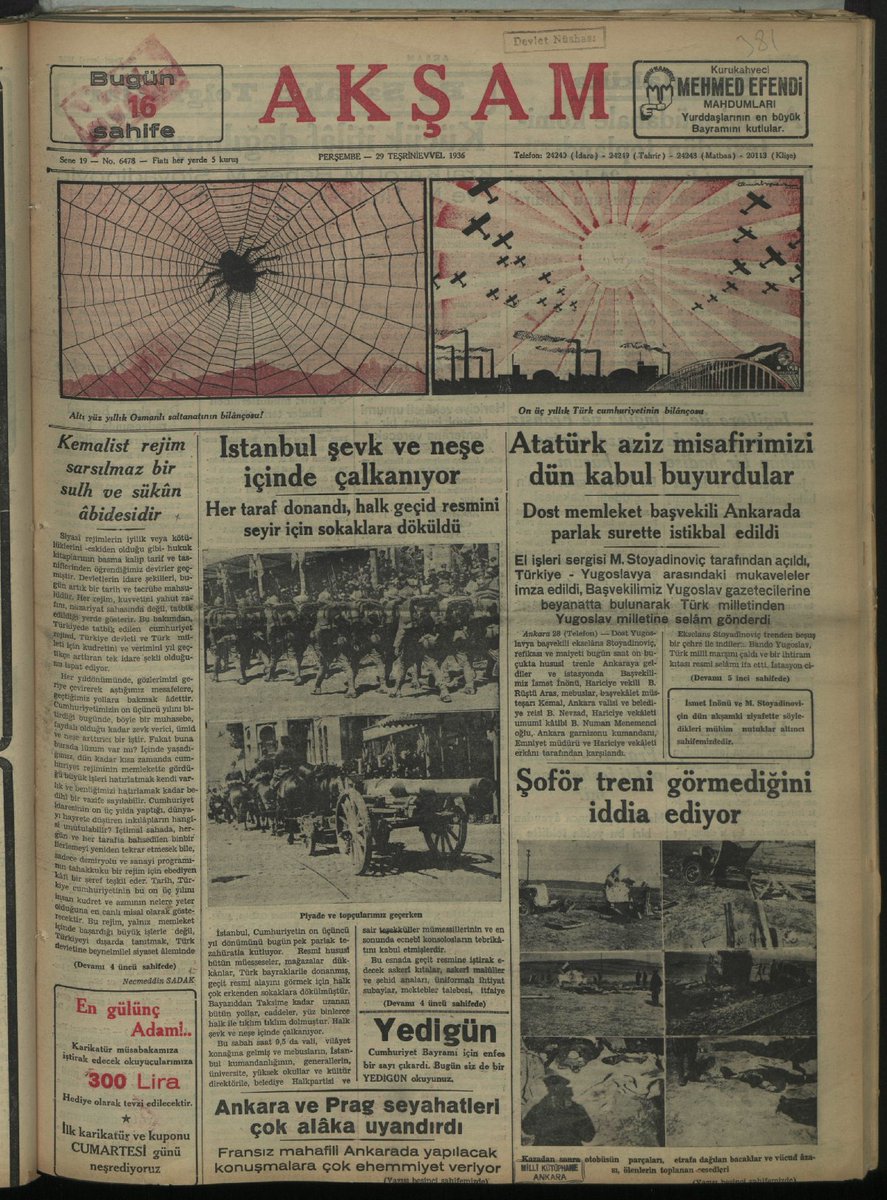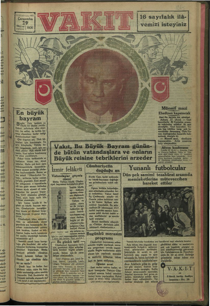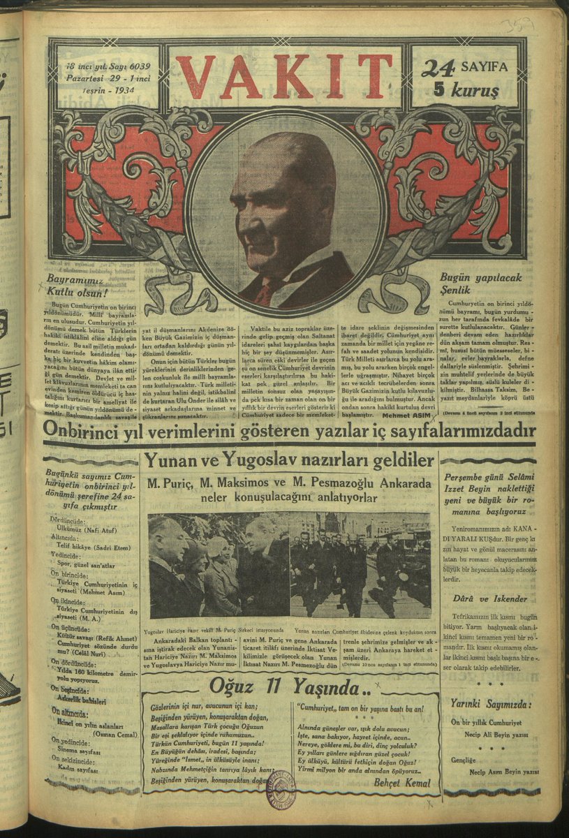 Matbuat (basın) ailesi bugün en büyük milli bayramımız şerefine çalışmayacak, yarın gazeteler intişar (yayımlanma) etmeyecektir. (29 Ekim 1929, Vakit)
