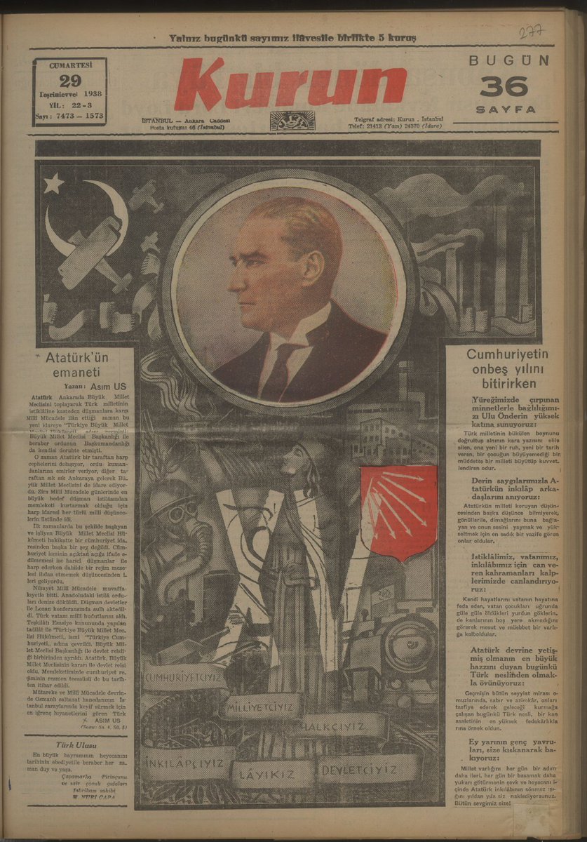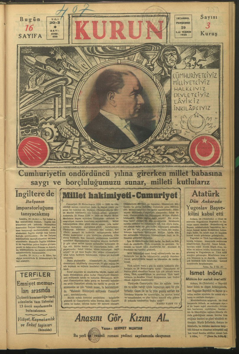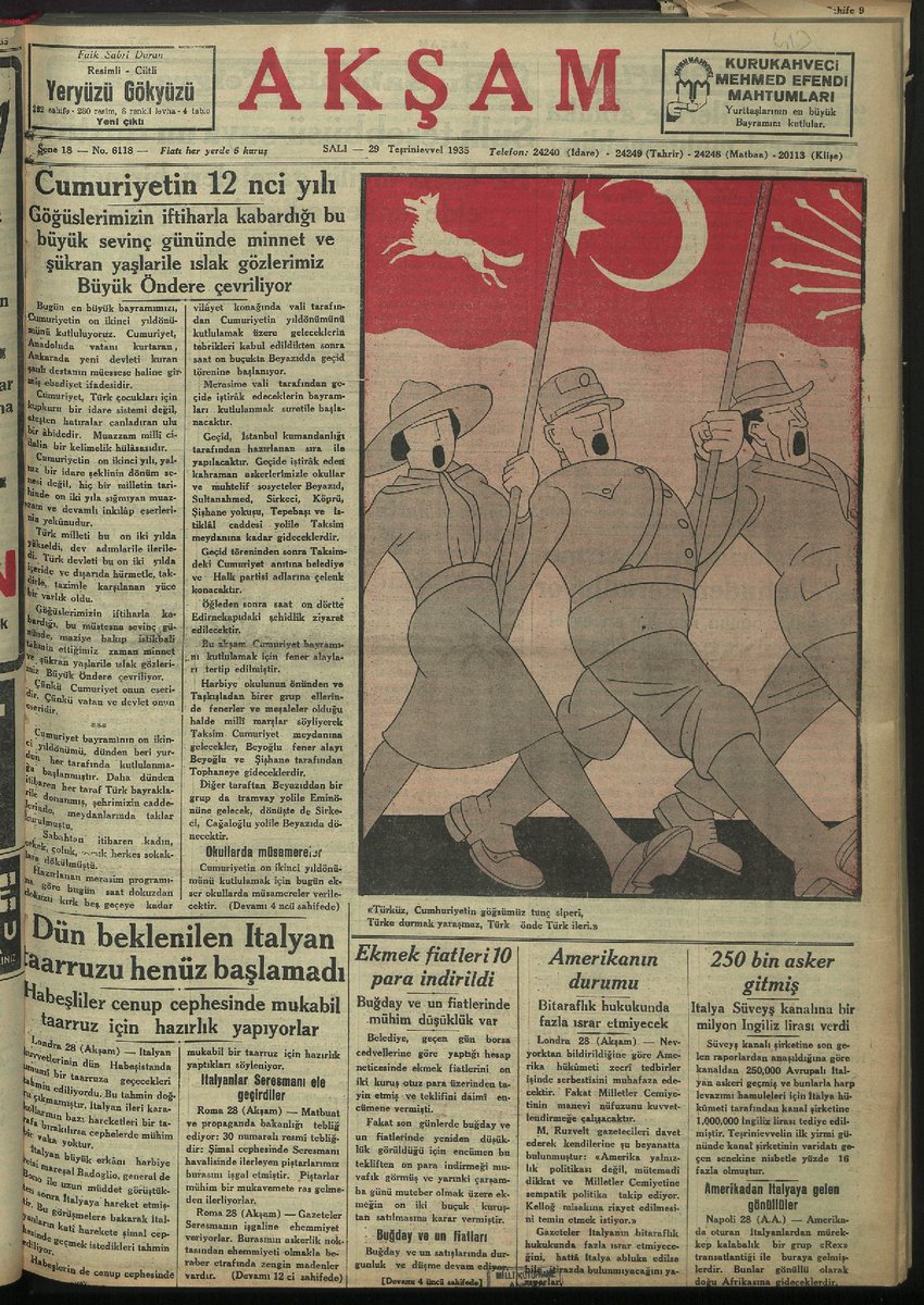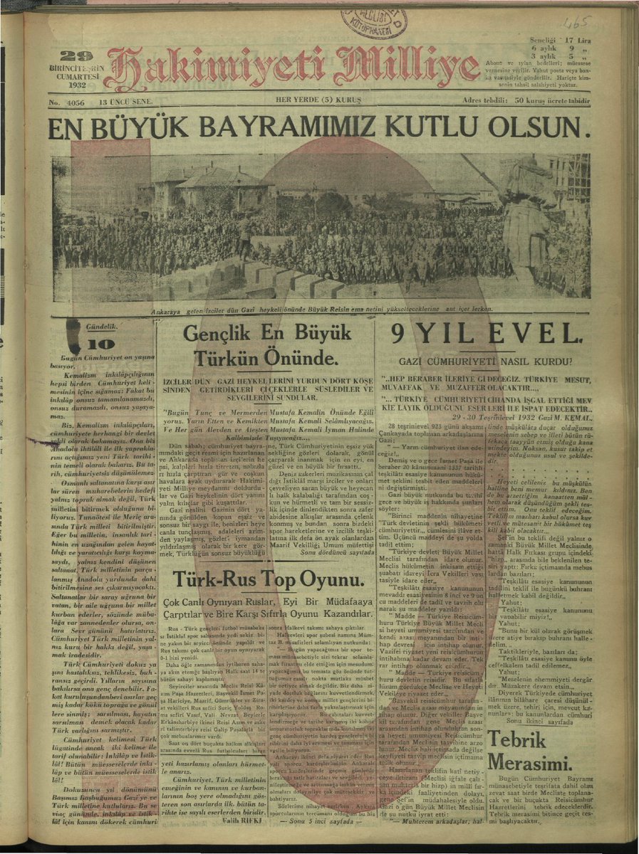 12 yıllık Cumhuriyet tarihi, dünyanın üstünde sulhun, insanlığa yardımın ve yaratıcılığın bayrağı gibi dalgalanıyor. (29 Ekim 1935, Kurun)