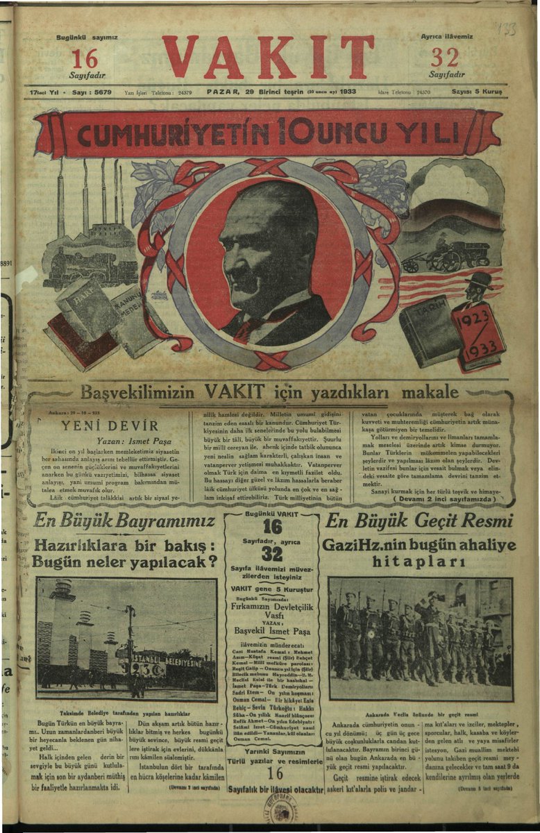 Türkiye'yi Sevr girdabından Lozan vahasına götüren yeni ruh, genç hamle bugün tamamıyla hukuki ve siyasi bir cephe alarak, senelerden beri fiilen devam eden halk idaresine resmi ve kat'i şekli verdi. (29 Ekim 1931, Vakit)