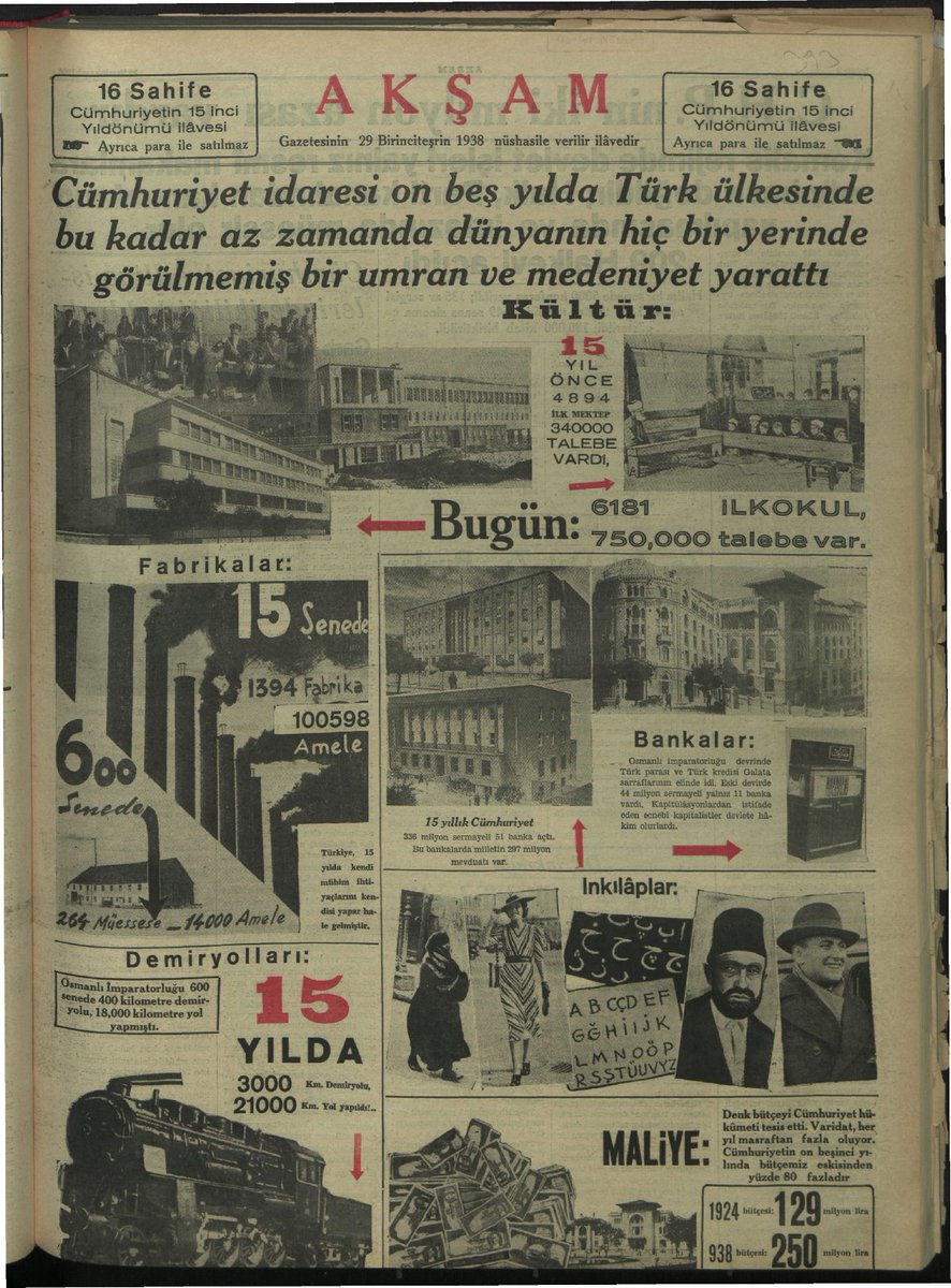 Cumhuriyet'in 16 senelik mazisi azametli ve muhteşemdir. Baaşardığımız eserle bir nesil değil, bir tarih övünebilir. Fakat bizim âdetimiz istikbale bakmaktır. (Falih Rıfkı Atay, 29 Ekim 1939, Ulus)