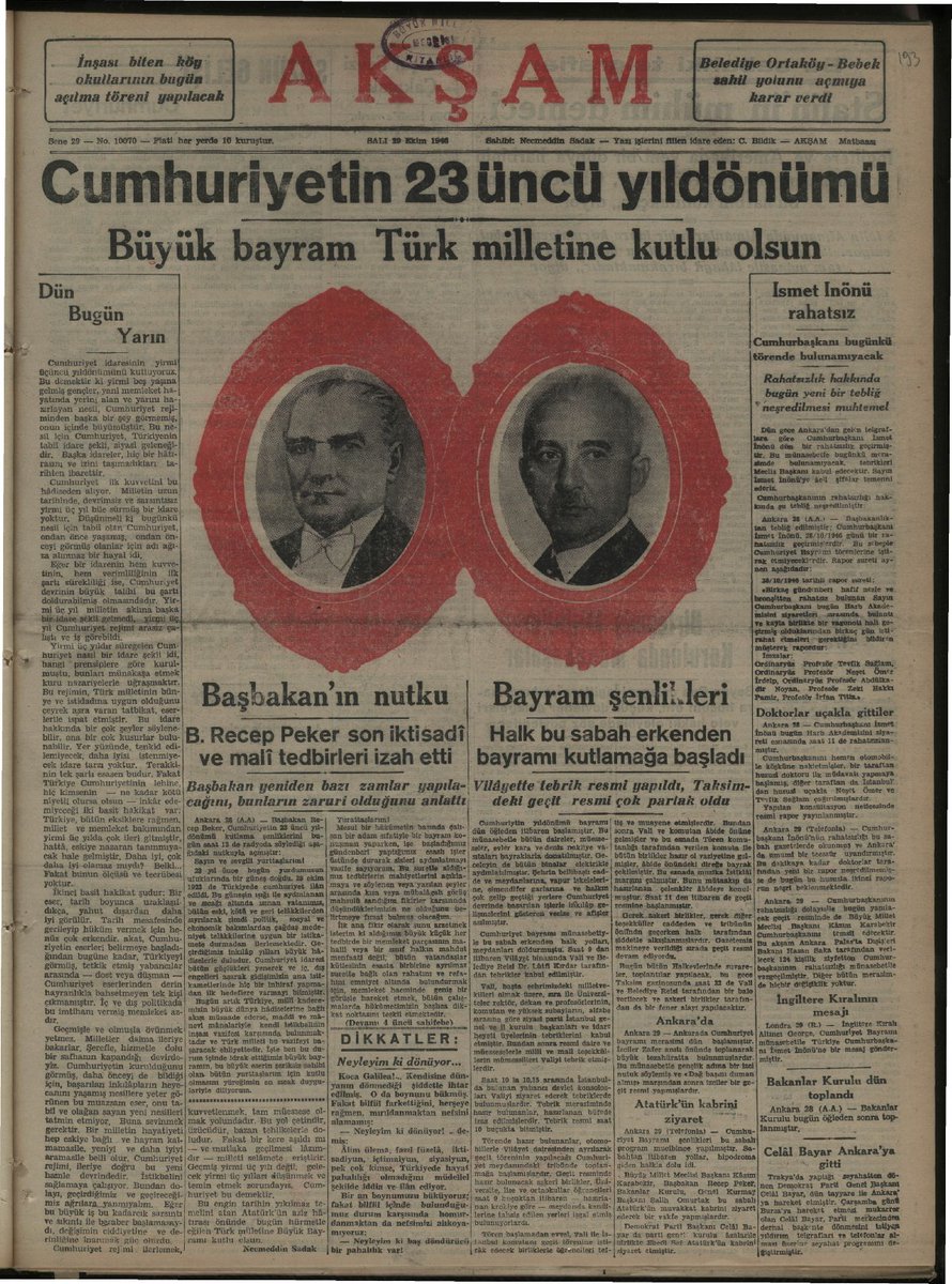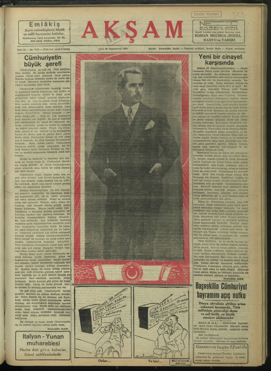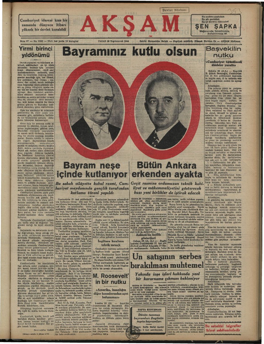 Cumhuriyet, Türkiye için sulh, sükun, refah ve umran devri oldu. (29 Ekim 1943, Akşam)