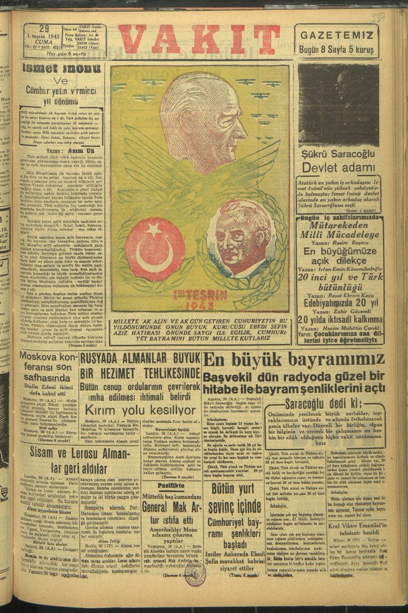 Dört seneden beri amansız bir harp bütün garp ve şark âlemini kan tufanına boğarken Türk milleti Cumhuriyet'in 20'inci yıldönümünü yine sulh güneşi altında kutluyor. (Asım Us, 29 Ekim 1943, Vakit)