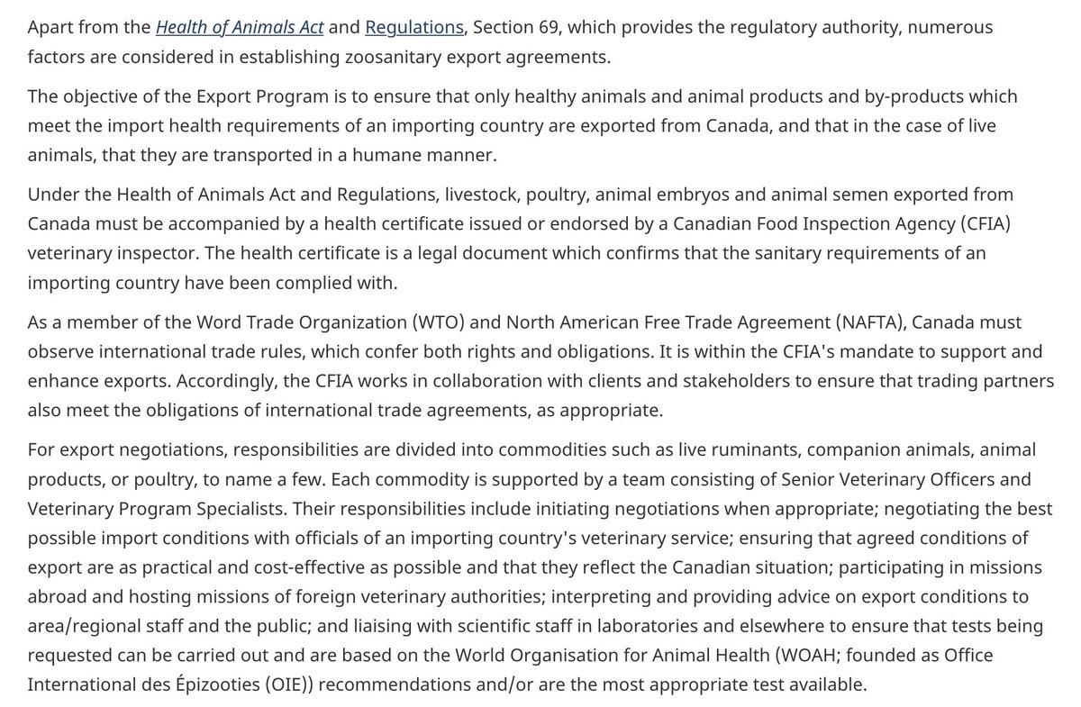 CFIA is responsible for ensuring the safety & health of Canadian people & animals by regulating agriculture & food. A big part of the agricultural mandate is to ensure compliance with trade partners' import requirements, to maintain trade. inspection.canada.ca/en/animal-heal…