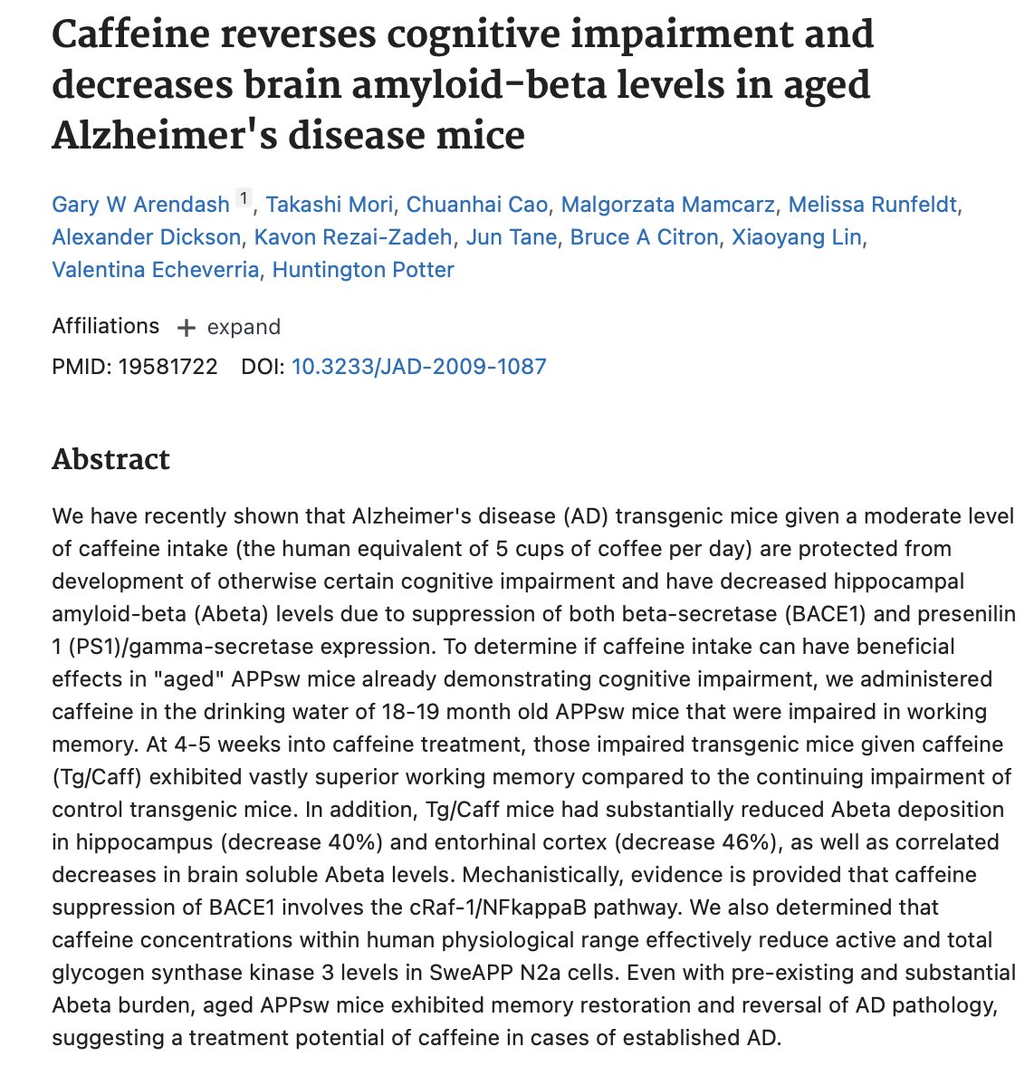 In this study on mice, caffeine was even able to reduce the cognitive impairment from Alzheimers