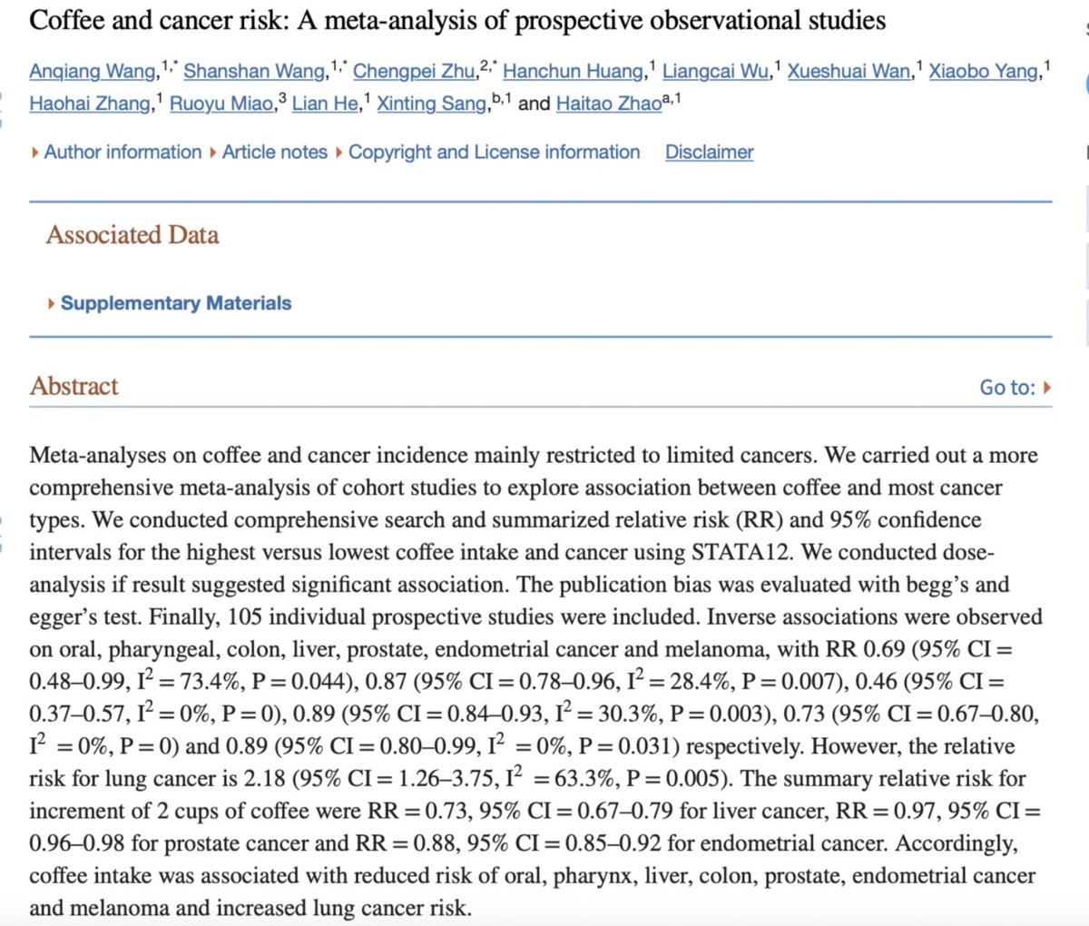 Coffee intake is associated with reduced risk of oral, pharynx, liver, colon, prostate, endometrial cancer and melanoma