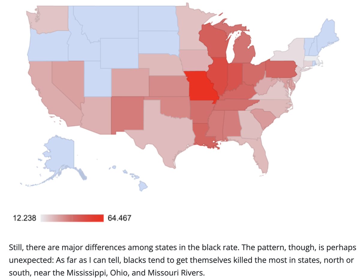 @mattyglesias Oddly, the black homicide victimization rate (almost all at the hands of other blacks) isn't particularly high, by black standards, in the Southeast. Instead, it's especially high in the vast Mississippi watershed in the middle of the country: