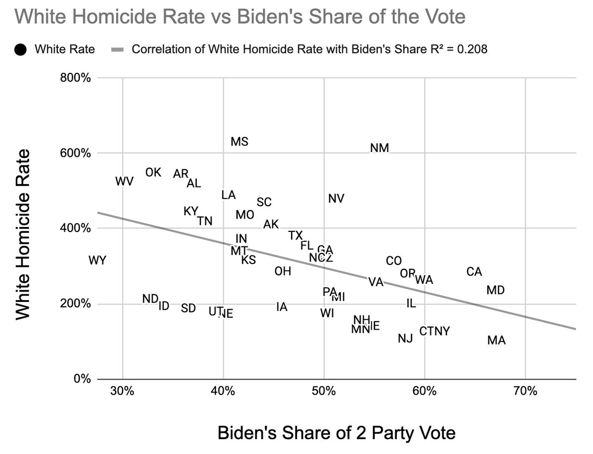 It's possible that voting for Biden correlates with stronger point of sale gun control laws correlate which correlates with lower homicide rates among law-abiding whites. Note, though, that heavily armed leftist Vermont has so few white murders it is left off due to sample size.