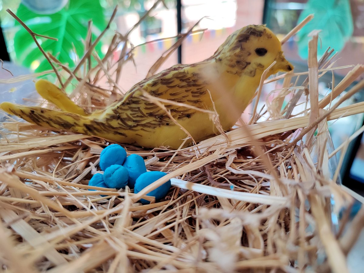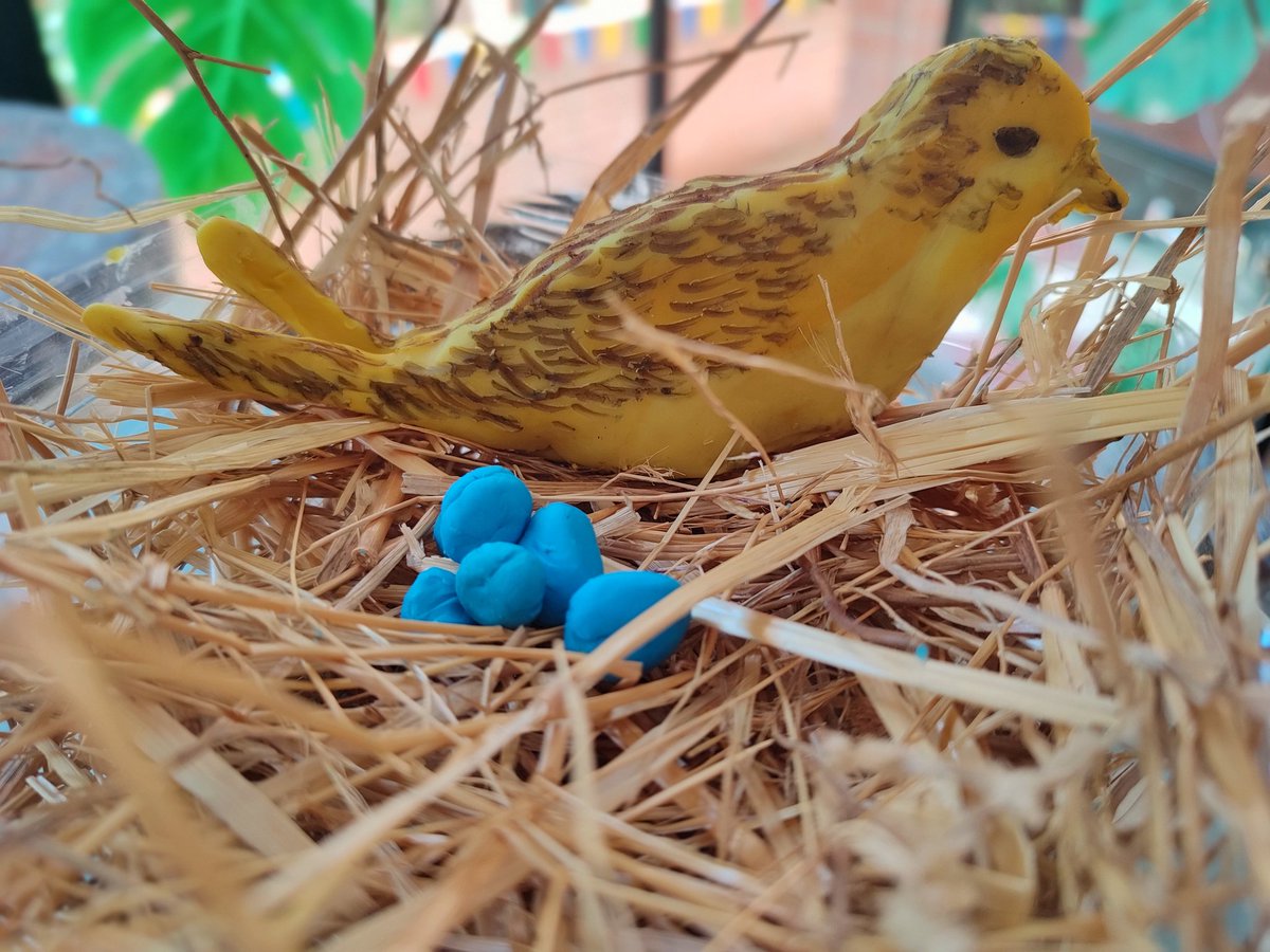 Los huevos son azulados, pero la plasti que nos quedaba tiene ese azul intenso.