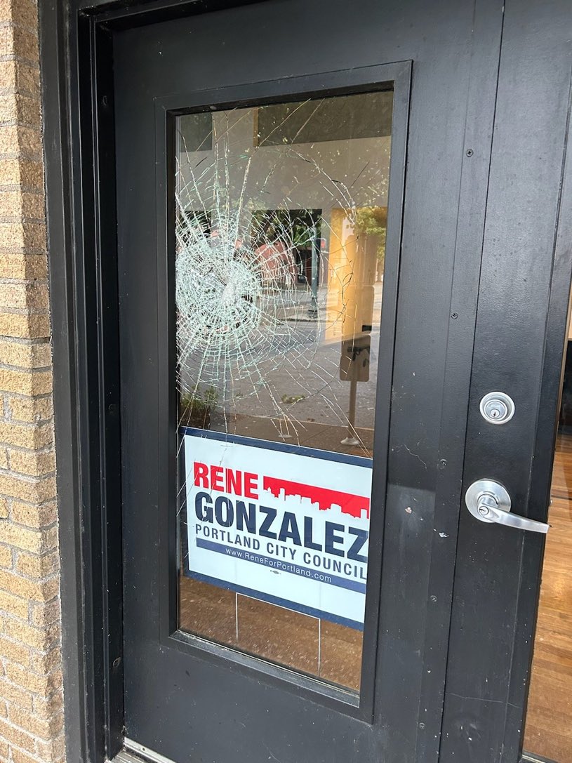 The office of moderate #Portland city council candidate @reneforportland was smashed again. #Antifa & violent far-left are among the most vocal supporters of his opponent, @JoAnnPDX. She is a far-left conspiracy theorist who claimed the 2020 arson riots were committed by police.