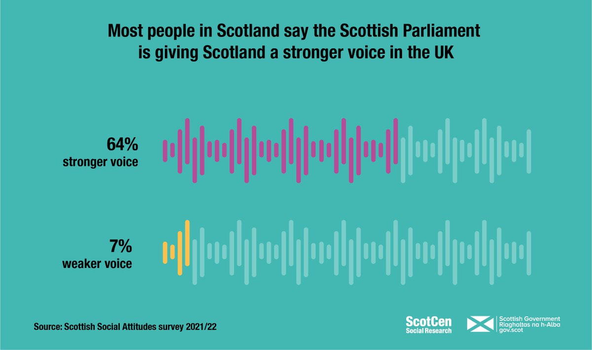 4/ The majority of people in Scotland say the Scottish Parliament is giving Scotland a stronger voice in the UK (64%), while 7% say it is giving Scotland a weaker voice.