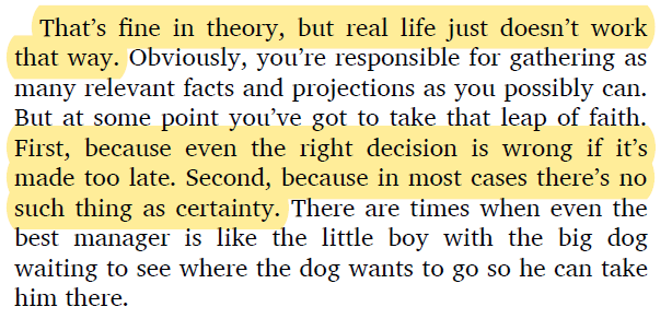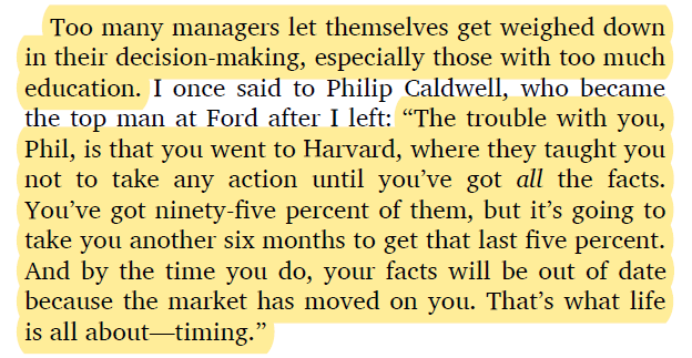 “The trouble is you went to Harvard. They taught you not to take action until you’ve got all the facts. You’ve got 95% of them, but it’s going to take another 6 months to get that last 5%. By the time you do, your facts will be out of date because the market has moved on you."