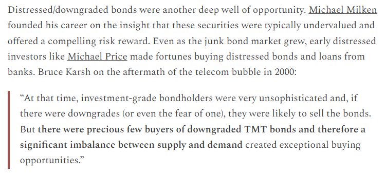 Sometimes it's about buying from an inflexible institution. Bonds that lost their investment grade rating used to be dropped like hot potatoes. Milken and the early generations of distressed investors built their careers around this inefficiency.