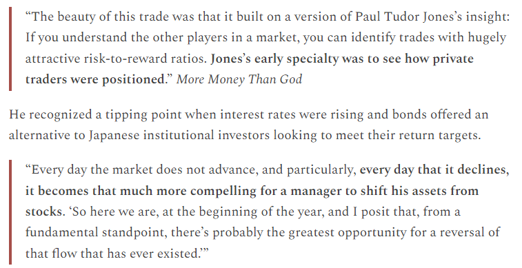 Paul Tudor Jones knew from the trading pit to pay attention to positioning. In the final years of the Japanese bubble, he paid close attention to the behavior of local institutional investors. Once they started shifting out of the market, it was over.