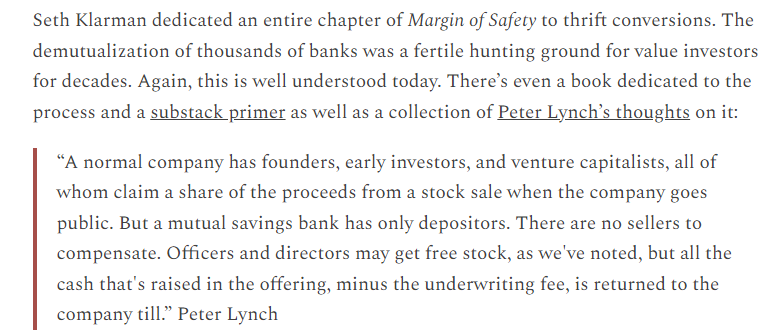 Demutualizations/thrift conversions offered opportunities for decades. How many depositors were really interested in exercising their right to become shareholders of their bank? How many knew how to value a bank?