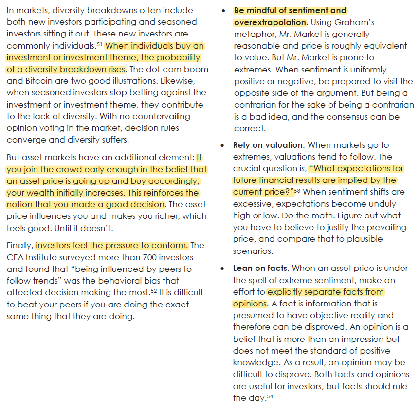 Separate facts from opinions. What does the price imply? Be mindful of sentiment, overextrapolation, pressure to conform.