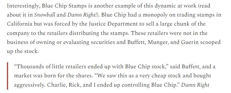 But also, Buffett and Munger scooped up Blue Chip shares when the Justice Department forced a sale of stock to many small retailers.