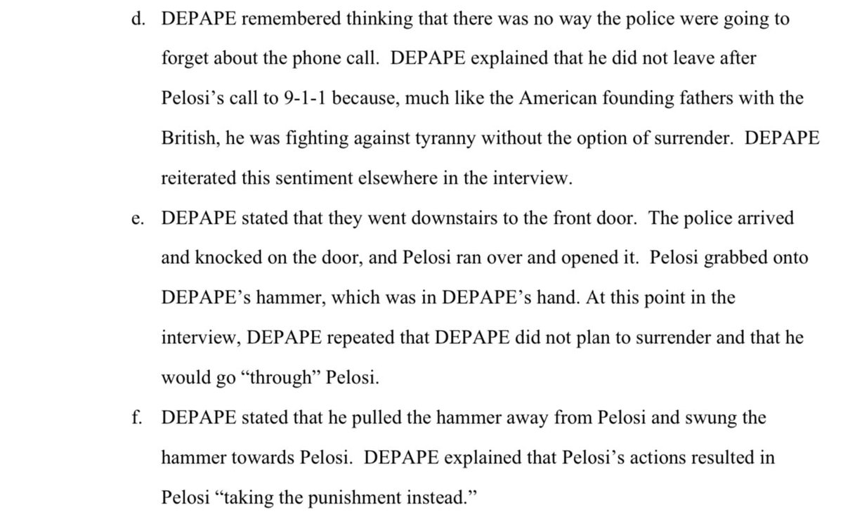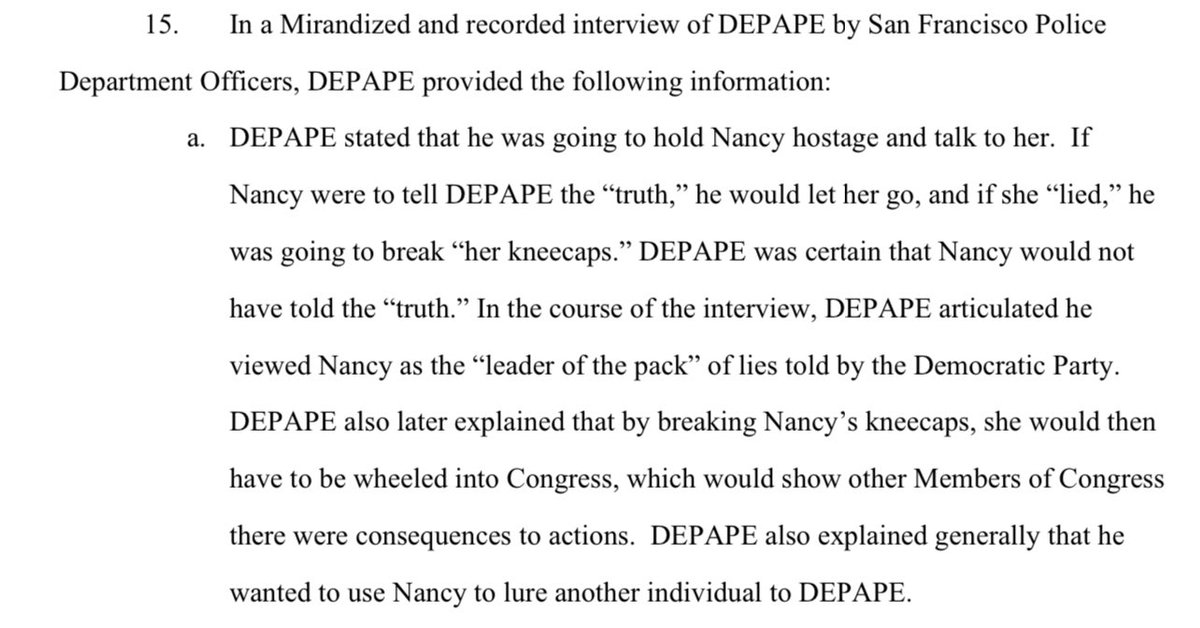 DePape said he would hold the Speaker hostage and BREAK HER KNEECAPS to show the world what happens when you’re the “leader of the pack of DEMOCRATIC lies”. Absolutely politically motivated. 4/