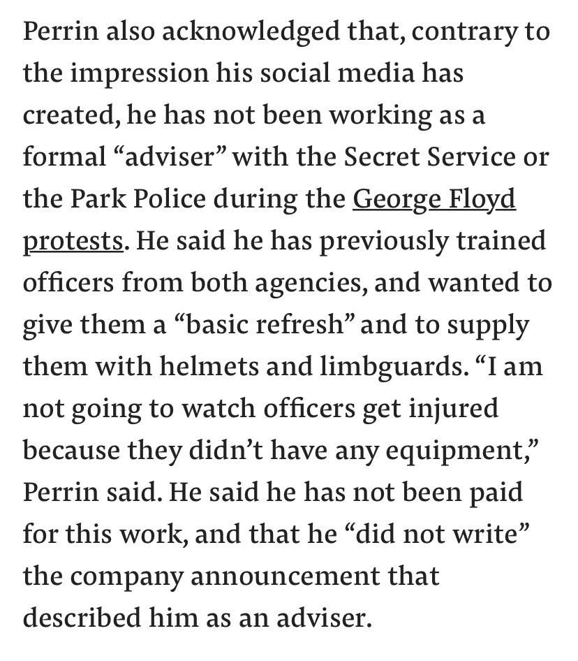 Perrin posted pictures from behind police lines the day before the President’s infamous Lafayette Square tear gas photo op. He says he's been advising the Secret Service after becoming a top tactical advisor in Britain. But @AlbertoNardelli and I found about his credentials: