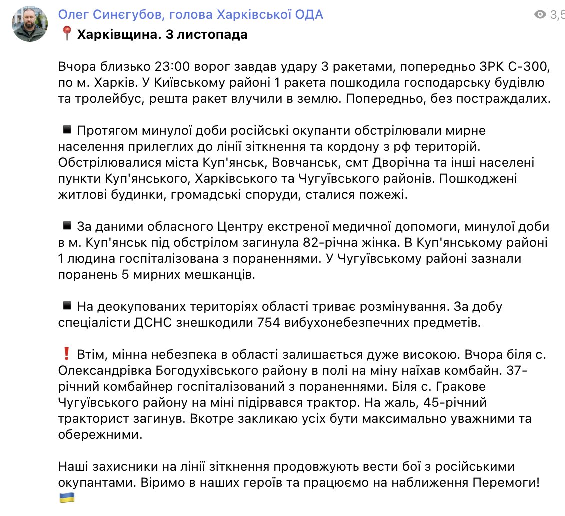Preliminarily, there were no casualties, – Oleh Syniehubov, the head of the Regional Military Administration