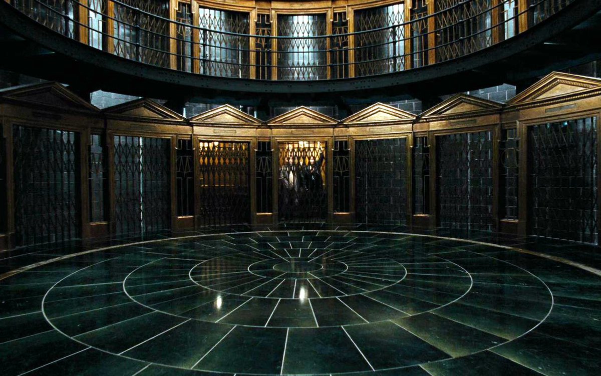 The Ministry of Magic's use of artfully crafted and lavish materials, such as bronze, gold, and marble, along with streamlined, modern forms and great size presents a vision of American (rather than English) Art Deco through and through.