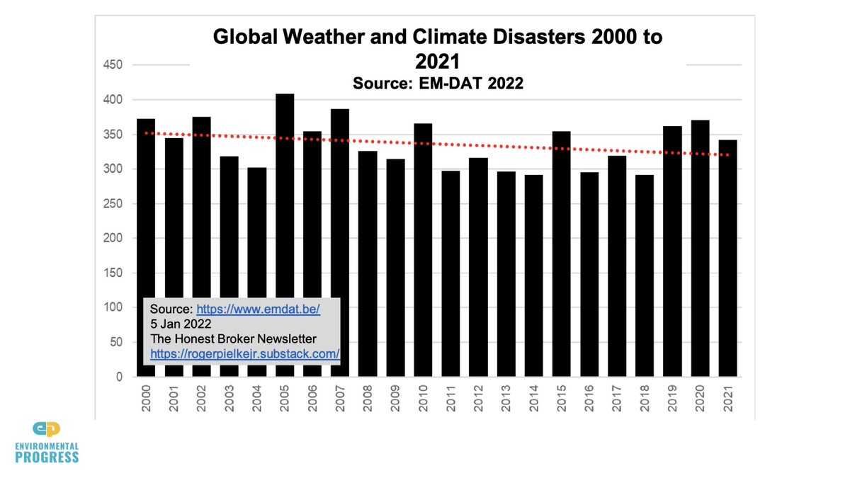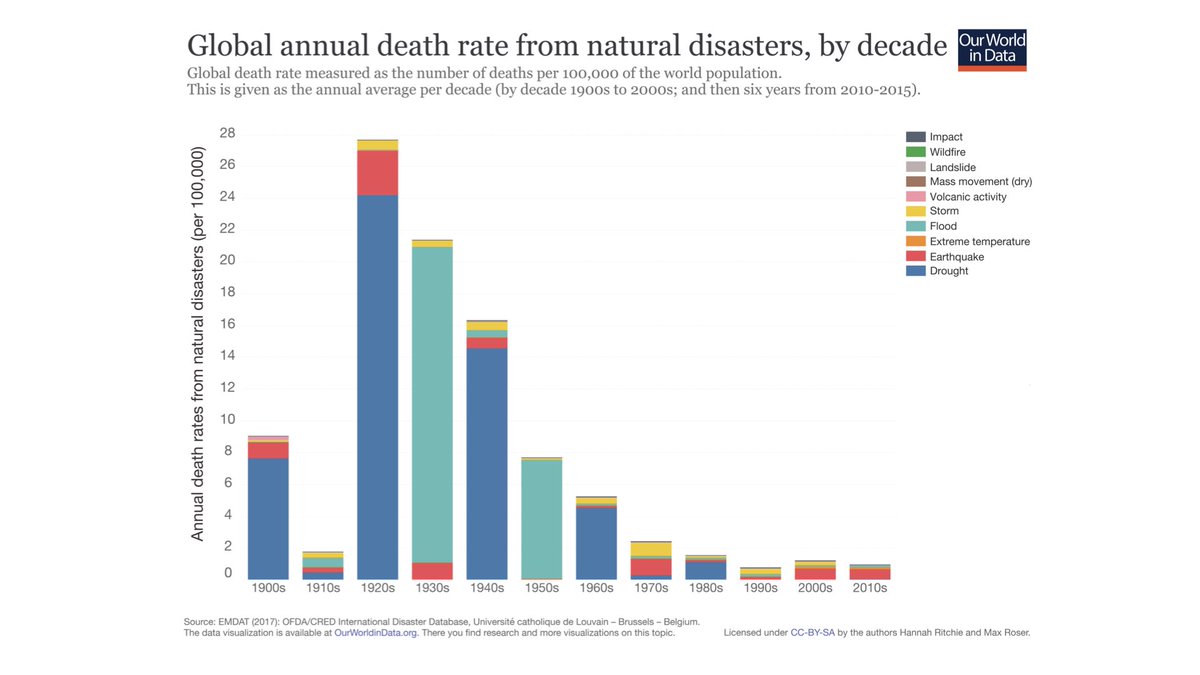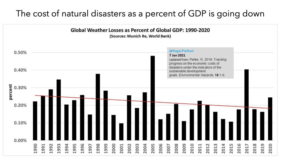 Total deaths from & costs of natural disasters are going down. That means fewer extreme weather events count as "natural disasters." Why? Because of rising human development and resilience to extreme weather thanks to "the whole capitalist system."