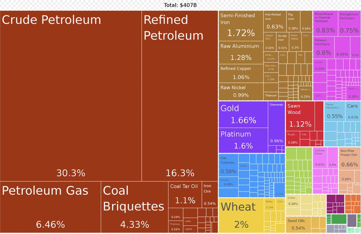 Le pays exportait en 2019 près de 400 milliards de dollars de biens et services. Comme vous le voyez à gauche, plus de la moitié de ces exports concernent le gaz et les produits pétroliers. Ces derniers représentent en moyenne 20% du PIB russe.
