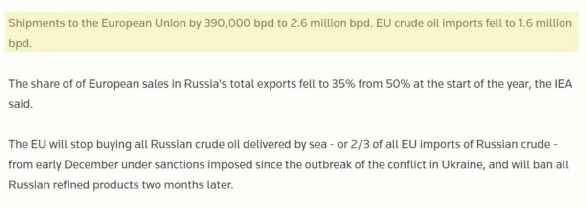 Pourquoi la situation est-elle catastrophique ? 1 la Russie s'est tirée une balle en bloquant les exports de gaz vers l'Europe et 2 ses exportations de pétrole BAISSENT avant même que l'embargo européen prévu pour le 5 décembre ne prenne effet !