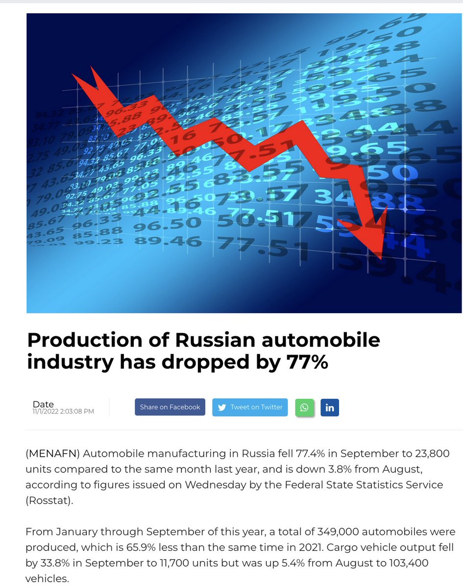 A noter l'effondrement de la production industrielle : -77% dans la production automobile sur un an, secteur qui emploie plus de 600 000 personnes. Bref : le secteur du gaz s'effondre (à cause de l'embargo.. de Poutine), le ptérole va dans le mur et l'industrie est KO.