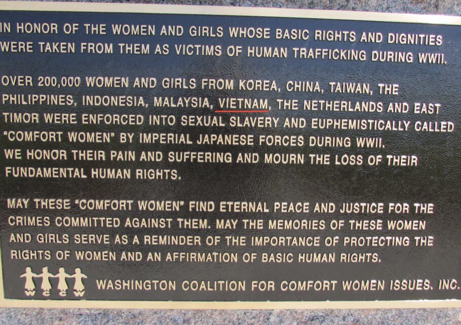 The statues of comfort women, whose number is increasing yearly around the world, inscribe the Japanese military abducted and 200,000 girls to become comfort women during WW II, and recently added Vietnam to inscription.